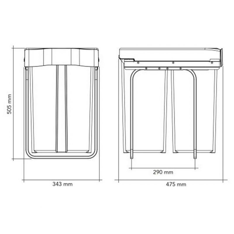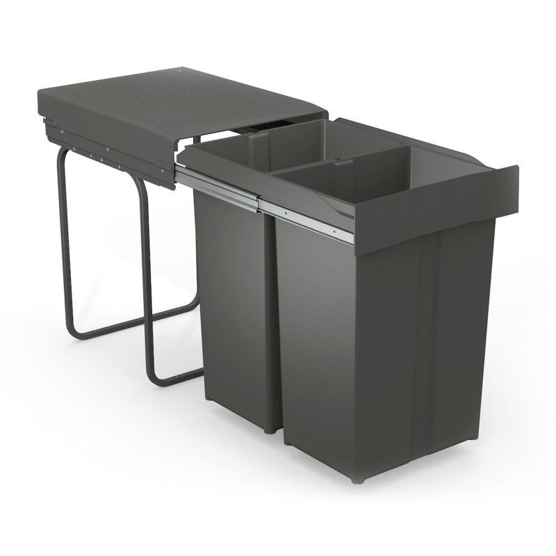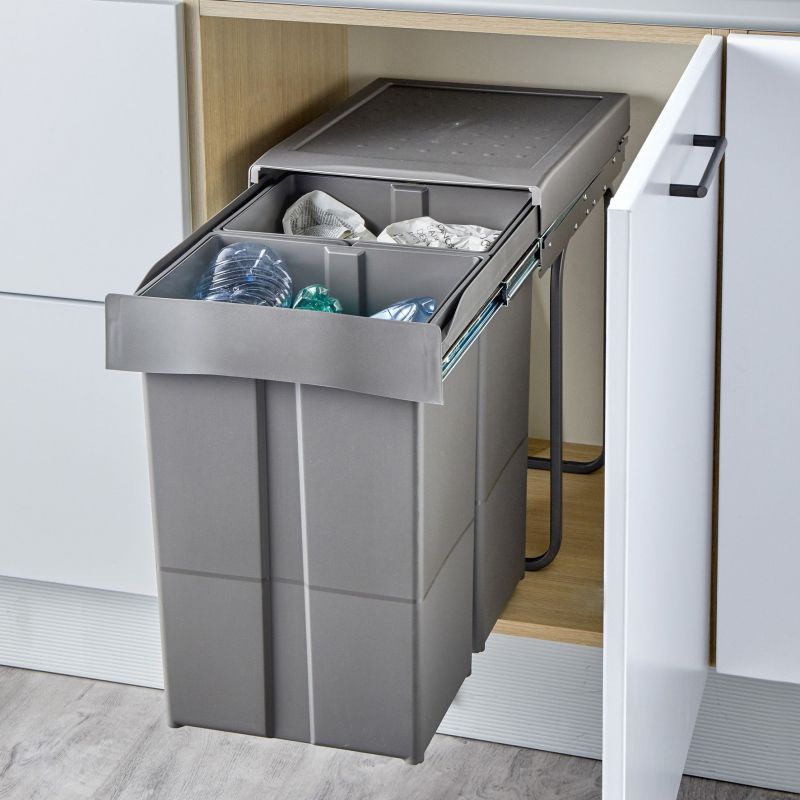 Poubelle 58L - 400mm - H.505mm-Gris orion Tri sélectif Descriptif : Couleur : Gris Orion Dimensions : h.505 x P.475 x l.343 mm Capacité totale : 58 L Nombre de seaux : 2 Pour un meuble de : 400 mm Fixation par vis sur cadre Bon à savoir : La poubelle se compose de 2 seaux de 29 L. Sortie totale de la poubelle. Ouverture manuelle. Conseil d'entretien : Ne pas utiliser de produit abrasif.