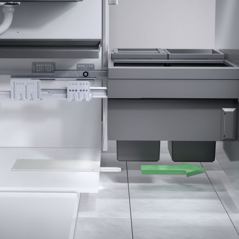 Le nouveau système d'ouverture automatique pour portes et tiroirs Hailo Libero 3.0, permet l'ouverture facile et automatique des poubelles, qui sont fixés sur la porte ou dans un tiroir bas.