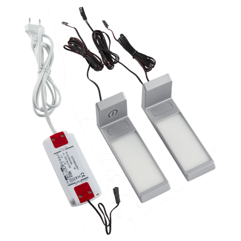 Kit 2 spots LED d'angle avec interrupteur tactile et convertisseur - finition aluminium - puissance 3W / 140lm - 12VDC - 4000K