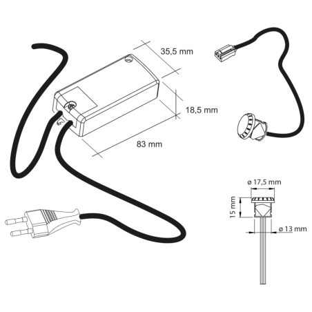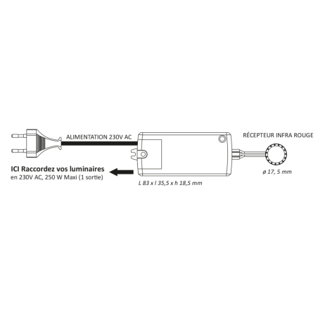 Équipé d’un câble d’alimentation de 2 mètres avec fiche euro, il offre une installation simple et flexible, adaptée aux besoins des cuisines modernes ou des aménagements intérieurs nécessitant un transformateur discret. Classé en II IP20, il assure un fonctionnement fiable en usage intérieur.