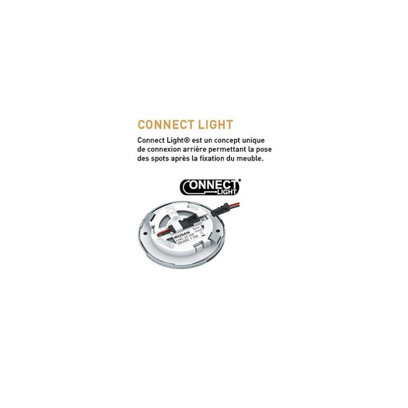 Pensé pour la praticité, ce kit intègre le système System Connect Light, facilitant l’installation ou le remplacement des spots, même après la fixation du meuble. Chaque spot LED 2W 12V DC offre un flux lumineux de 50 lumens avec un IRC supérieur à 90 et un angle d’éclairage de 360°, pour une lumière agréable et naturelle. Son interrupteur infra-rouge inclus permet un contrôle simple et intuitif, détectant soit le passage de la main, soit l’ouverture d’une porte, avec une portée jusqu’à 7 cm. Le kit comprend un convertisseur 15W capable de gérer jusqu’à 6 spots, assurant une installation sécurisée et adaptable.