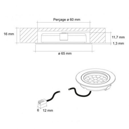 Pensé pour une installation simple et rapide, ce kit comprend deux spots LED de 2,4 W chacun ainsi qu’un convertisseur inclus pour un branchement immédiat en 12V. La fixation par ressort facilite l’encastrement dans un perçage de 60 mm, tandis que le câble d’alimentation de 1,5 m apporte une vraie souplesse de pose. Avec un flux lumineux de 200 lumens par spot, un angle d’éclairage de 40° et un IRC supérieur à 80, l’éclairage est précis, confortable et fiable dans le temps grâce à une durée de vie de 30 000 heures.