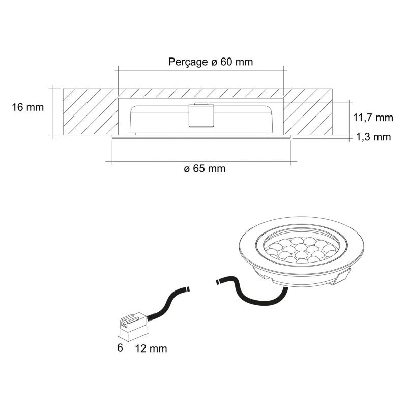 Pensé pour une installation simple et rapide, ce kit comprend 3 spots LED de 2,4 W ainsi qu’un convertisseur inclus pour un raccordement direct en 12V. La fixation par ressort permet un encastrement facile dans un perçage de 60 mm, tandis que le câble d’alimentation de 1,5 m facilite la mise en œuvre. Chaque spot délivre 200 lumens avec un angle d’éclairage de 40° et un IRC supérieur à 80, garantissant un éclairage précis et fiable.