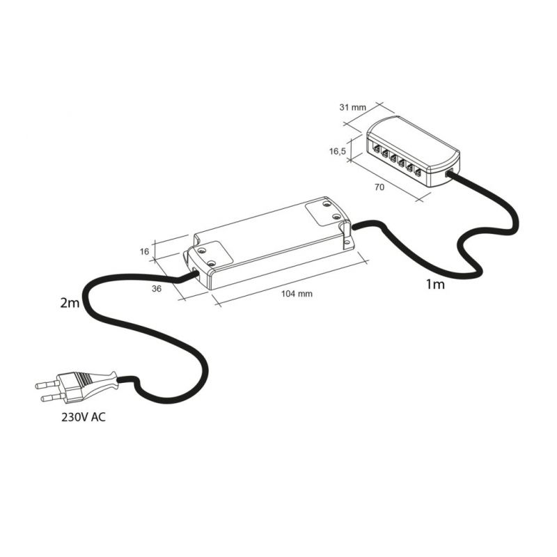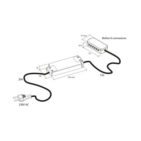 Polyvalent et simple à mettre en œuvre, ce convertisseur accepte une puissance de 1 à 15 W en 12V et dispose de jusqu’à 6 connexions pour alimenter plusieurs points lumineux. Son câble d’alimentation de 2 mètres avec fiche euro facilite le branchement et offre une grande souplesse d’installation.
