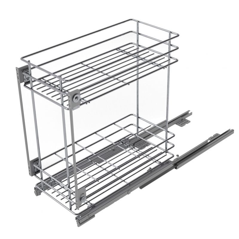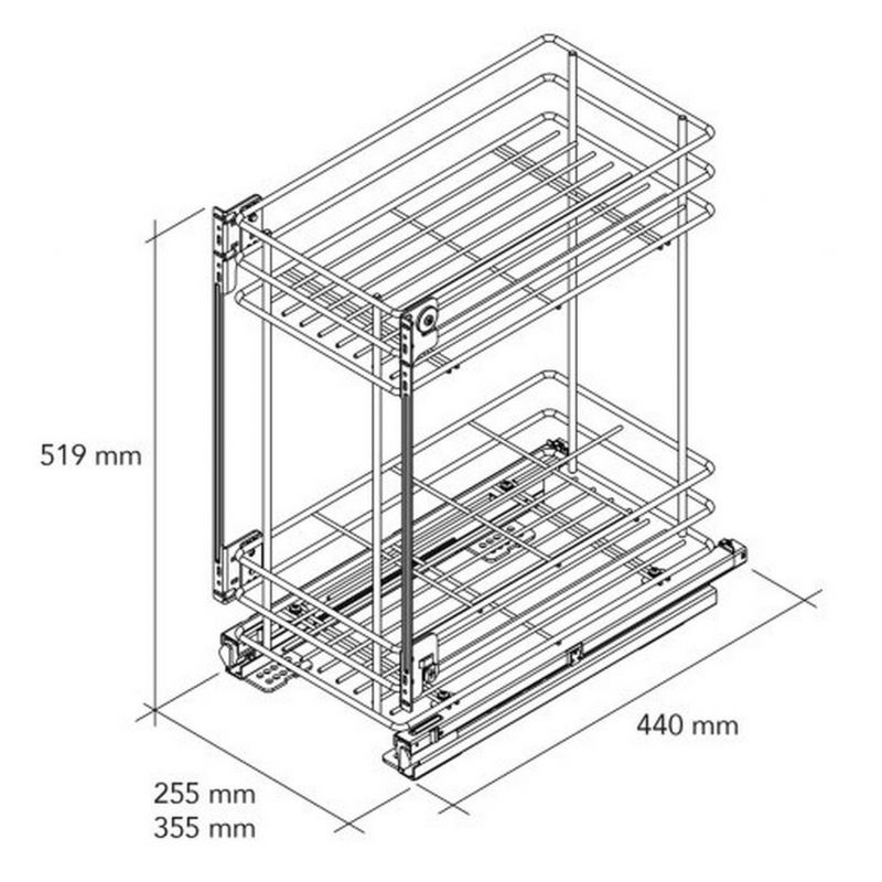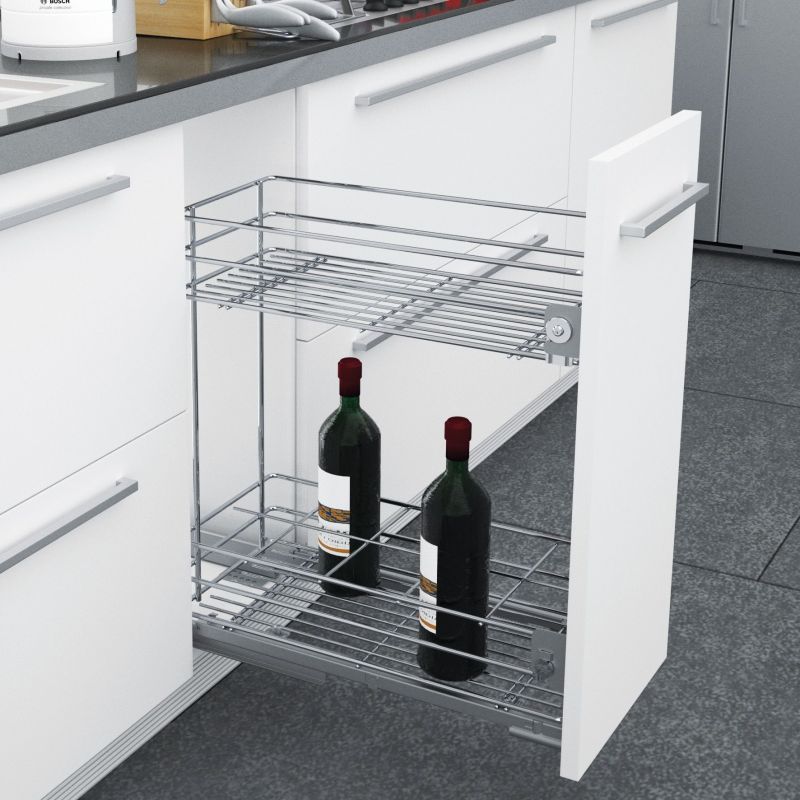 Panier universel Chromé - Pour meuble de 400mm - Capacité 8 bouteilles Descriptif : Couleur : Chrome Dimensions : H.520 x P.490 x l.358 mm Charge maxi : 30kg Pour meuble de : 400 mm Fixation sur fond et porte du meuble Bon à savoir : Installation simple Livré avec séparateurs bouteilles Sortie totale par Soft closing Pour meuble de profondeur 500mm Conseil d'entretien : Ne pas utiliser de produit abrasif.