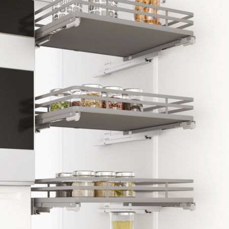 Panier de rangement pour meuble de 600mm - structure en fils carrés gris avec fond en bois mélaminé gris - sortie totale avec système SOFT