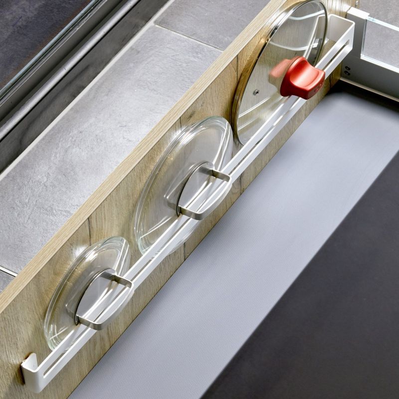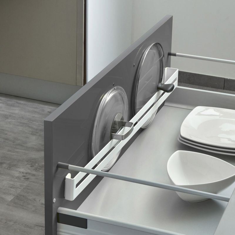 Barre range-couvercles en acier blanc - longueur 790 mm Descriptif : Couleur : blanc Dimensions : H. 60 x L. 790 x l. 42 mm Fixation par vis (non fournies) à l'intérieur d'un meuble ou d'un tiroir. Bon à savoir : Barre en acier à monter dans un tiroir, spécialement étudiée pour le stockage des couvercles de Ø 100 à Ø 320 mm. Conseil d'entretien : Ne pas utiliser de produit abrasif.