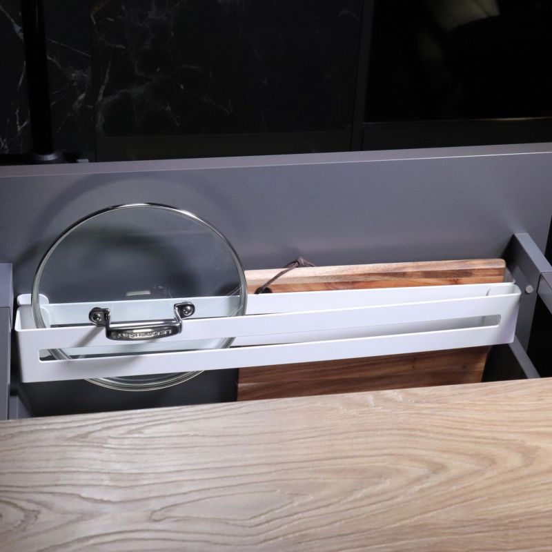 Barre en acier à monter dans un tiroir, spécialement étudiée pour le stockage des couvercles de Ø 100 à Ø 320 mm.