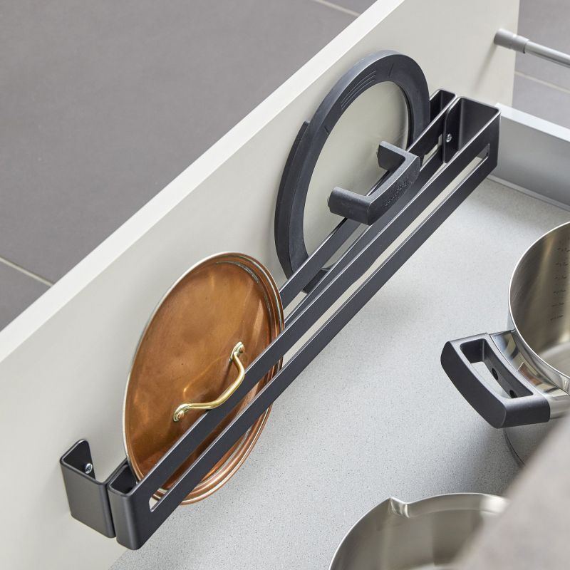 Barre en acier à monter dans un tiroir, spécialement étudiée pour le stockage des couvercles de Ø 100 à Ø 320 mm.