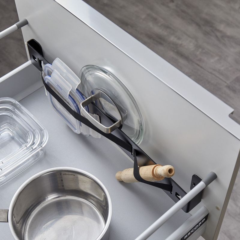 Permet de stocker des ustensiles avec l'élastique: poignée de casserole, petite balance, couvercle de tupperware...