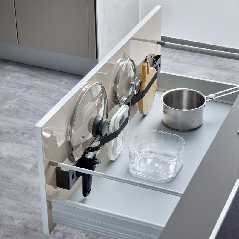 Barre en acier à monter dans un tiroir, spécialement étudiée pour le stockage des couvercles de Ø 100 à Ø 320 mm.