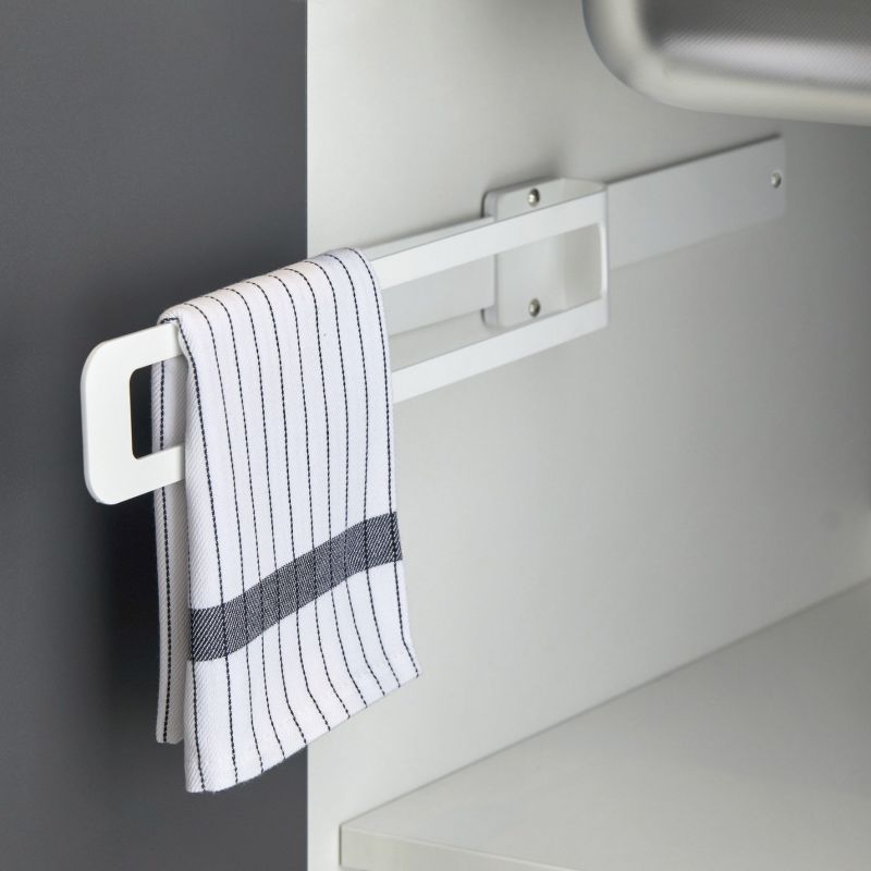 Porte-torchons coulissant en acier vernis blanc mat Descriptif : Couleur : Blanc mat Dimensions : H. 65 x L. 336 x l. 30 mm Position rentrée: 395mm Position dépliée: 720mm Fixation par vis à l'intérieur ou la joue d'un meuble ou d'un tiroir. Bon à savoir : Vis non fournies. Entretoises fournies Conseil d'entretien : Ne pas utiliser de produit abrasif.