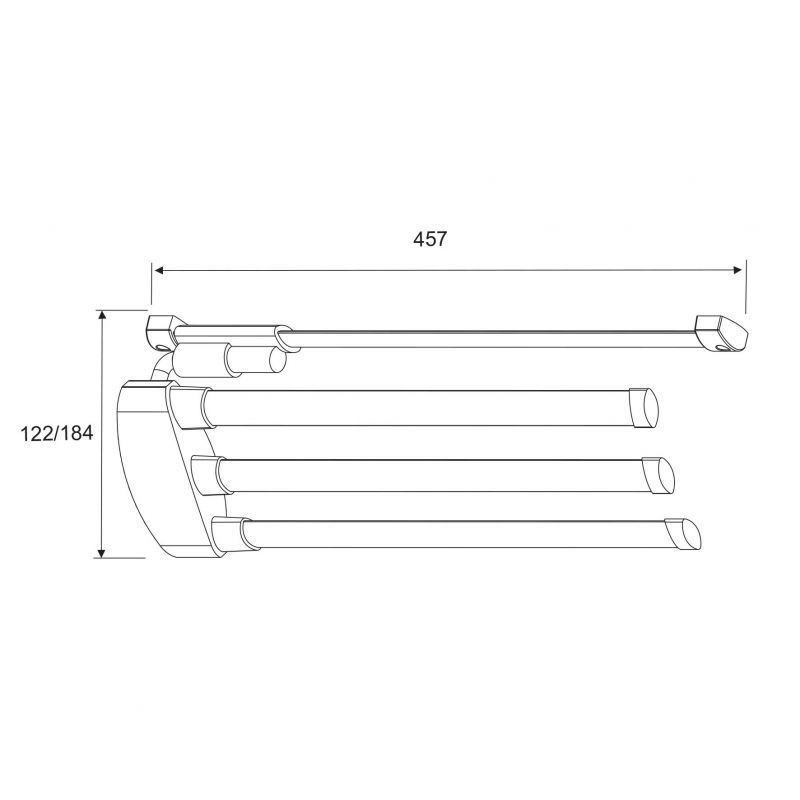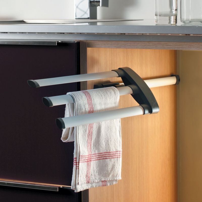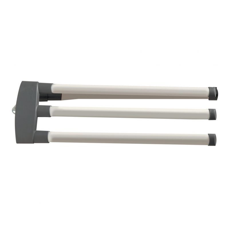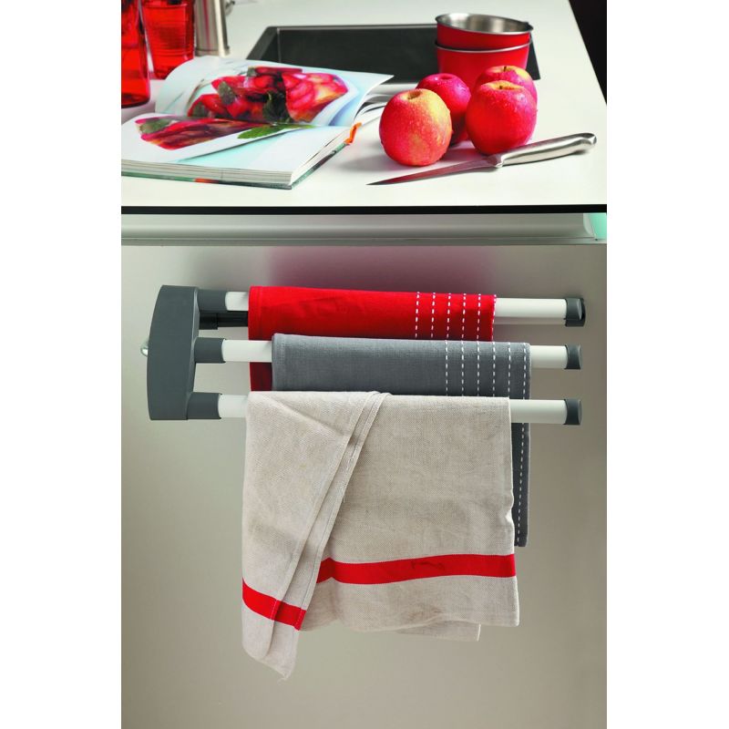 Porte-torchons 3 branches aluminium Descriptif : Couleur : Aluminium Dimensions : h. 184 x L. 457 mm Fixation par vis à l'intérieur ou à l'extérieur du meuble. Bon à savoir : Embouts en PVC. Les 3 branches sont extractibles. Pour cuisine. Conseil d'entretien : Ne pas utiliser de produit abrasif.
