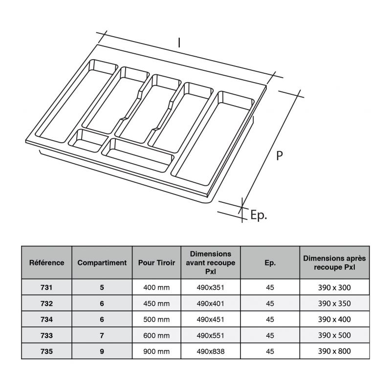 Range-couverts pour tiroir de 500mm composé de 6 compartiments - finition gris orion