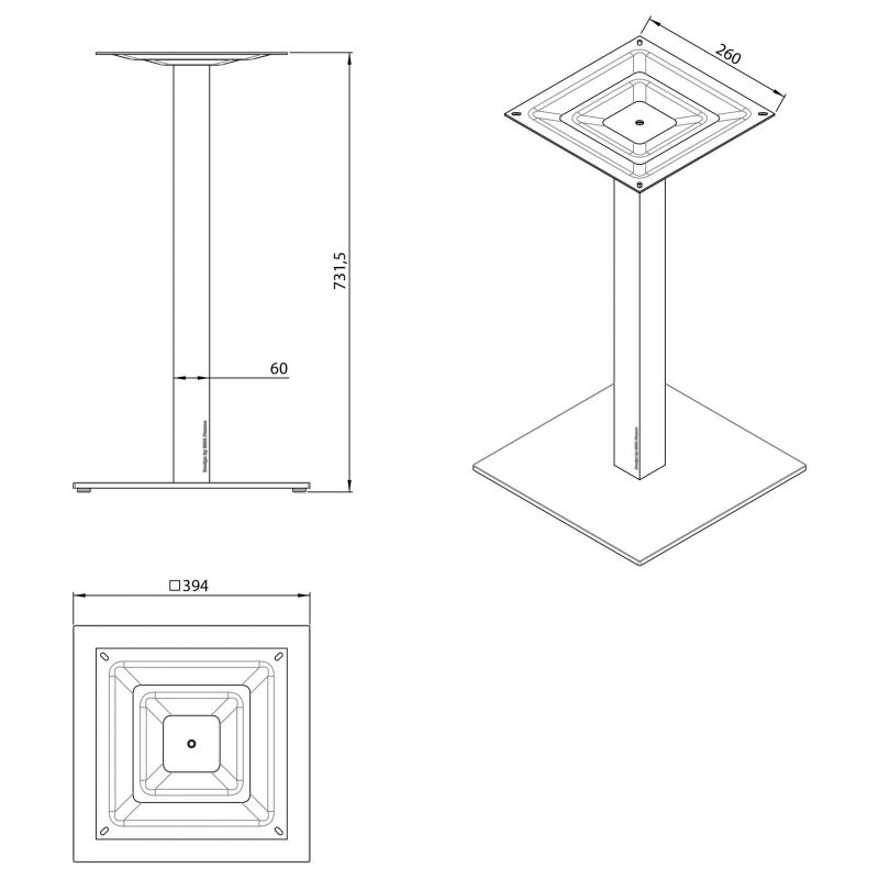 Dimensions : socle 400 x 400 mm h. 730 mm profil 60 x 60 mm platine de fixation 320 x 320 mm