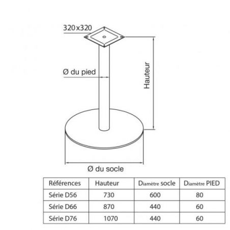 Dimensions : D. socle 600 mm D. pied 80 mm H. 730 mm support de fixation 320 x 320 mm
