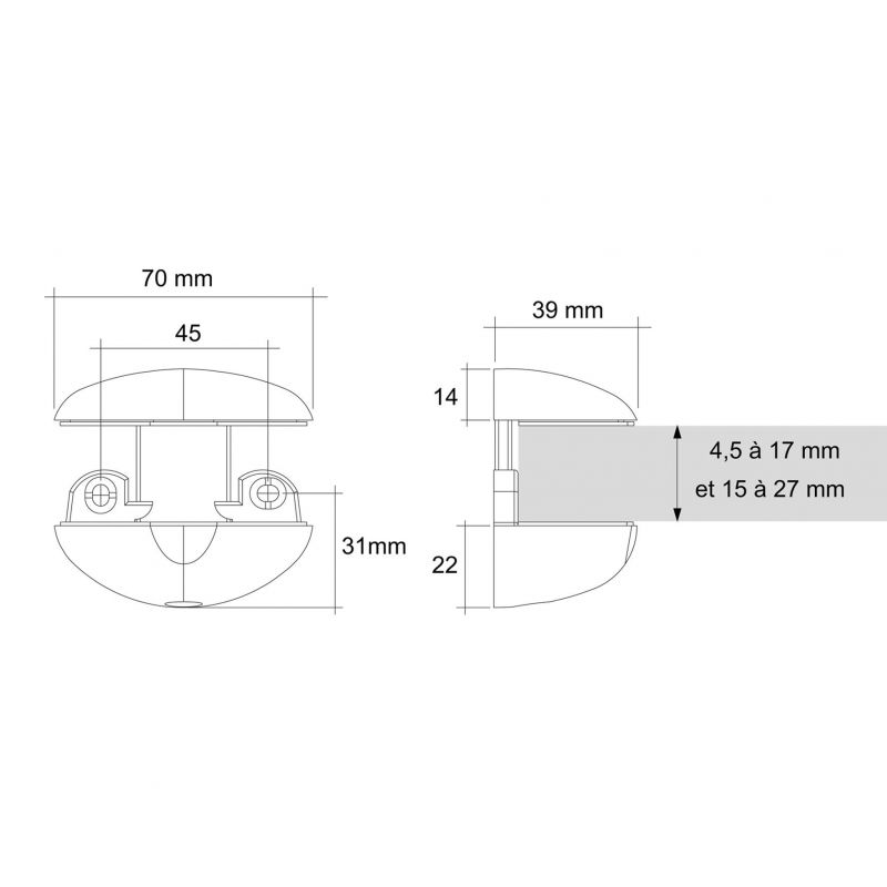 Support permettant de fixer des tablettes en verre de 4,5 à 17mm ou en bois de 15 à 27 mm d'épaisseur.