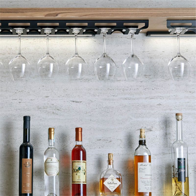 Porte-verre SLIDE- Finition noir mat- Capacité 7 gros verres-l.840mm Descriptif: Couleur: Noir mat Capacité : 7 verres Dimension: P.126mm,l.840mm Fixation sous meuble haut ou étagère (vis non fournies) Bon à savoir: Profil extra fin Inclinaison pour faciliter la prise Conseil d'entretien: Ne pas utiliser de produits abrasifs