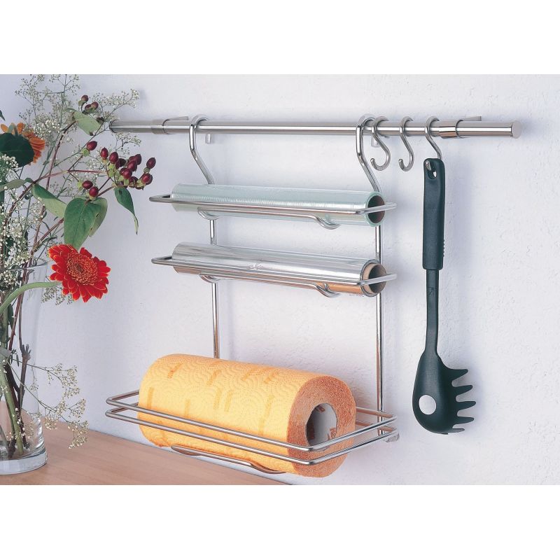 Kit barre de crédence ronde diamètre 16mm en acier avec 3 crochets, supports design - longueur 900mm, Inox brossé