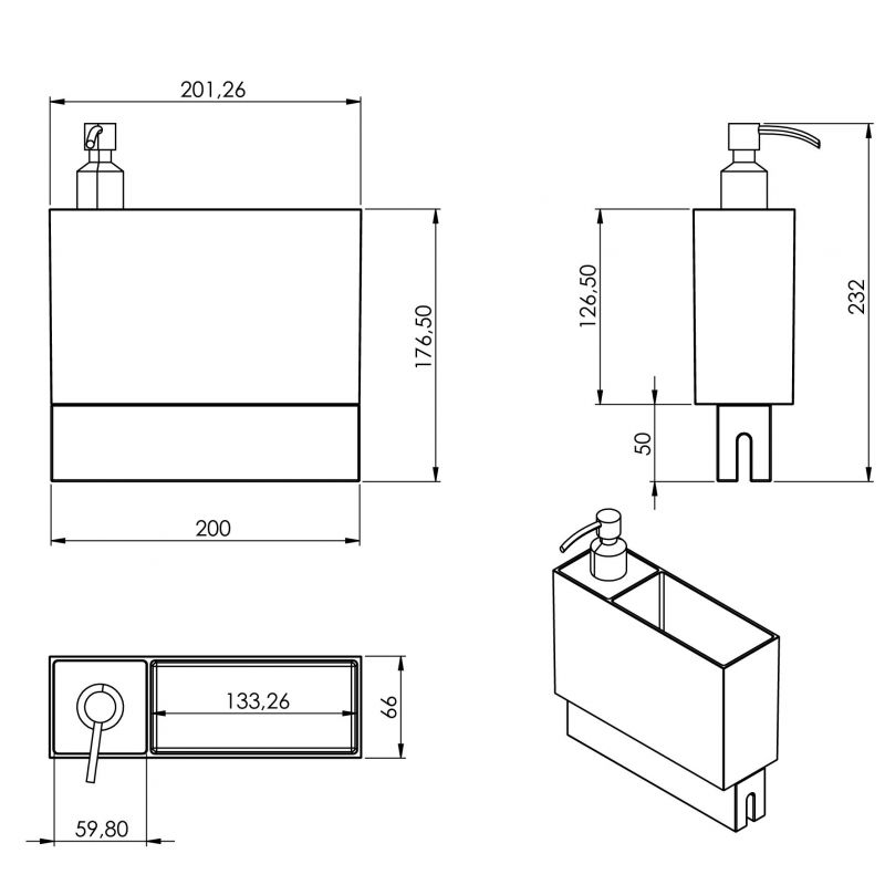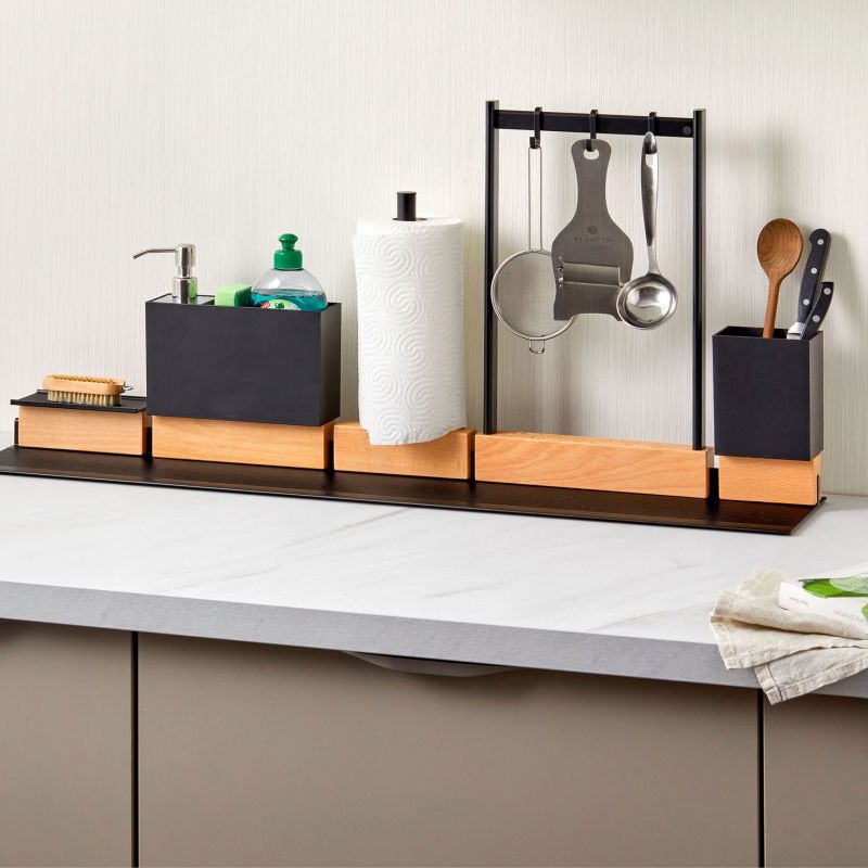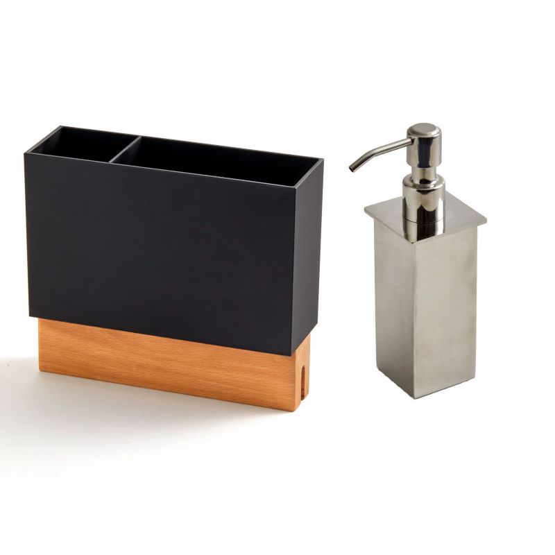 Distributeur de savon et bac plastique noir- L. 202mm- Finition inox, noir et hêtre- Pour organiseur d'ilot ou plan de travail