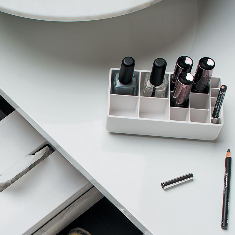 Le rangement est constitué de 3 boîtes de rangement, d'un range cosmétiques et d'un bac porte objets.