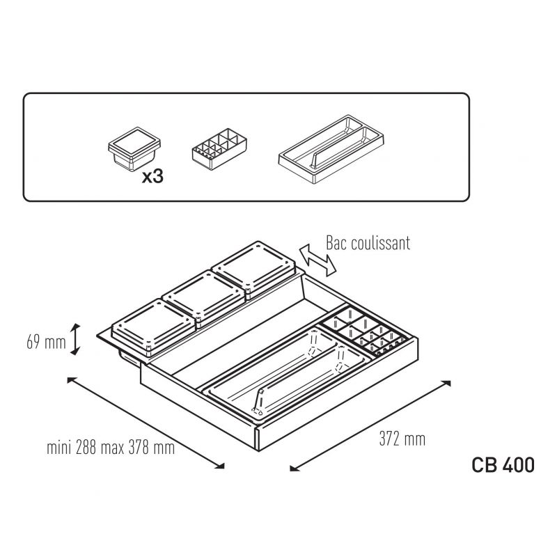 Accessoires pour tiroir supérieur de meuble de salle de bains-Structure en PVC blanc-3 boîtes de rangement-Range-cosmétiques-Bac porte-objets-L.288/378mm-p.372mm-H.69mm