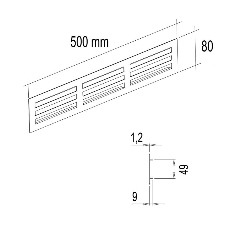 Grille d'aération en acier- 500x80mm- Finition noir Grille de plinthe en acier- Grille standard 500 x 80 mm Descriptif: Couleur: Noir Dimensions : 500 x 80mm A encastrer dans une plinthe de 16 ou 19mm pour aération du réfrigérateur, micro-ondes... Bon à savoir: Surface de passage d'air: 126cm2 Cote de découpe: 436x50mm Conseil d'entretien: Ne pas utiliser de produit abrasif