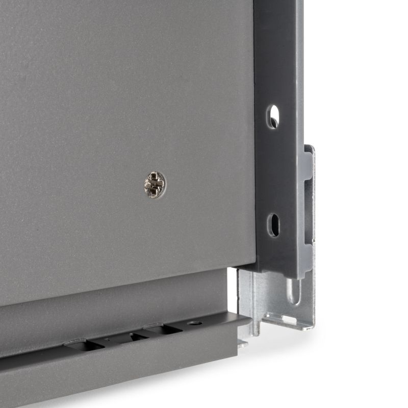 Les côtés latéraux métalliques sont en acier avec finition peinte en gris anthracite et permettent d'un réglage frontal en 3D : vertical au moyen d'un excentrique de ±2 mm, horizontal ±1 mm, inclinaison -1,5/+4 mm. Les coulisses sont à sortie totale avec fermeture amortie et permettent une charge maximale de 40 Kg pour le tiroir.