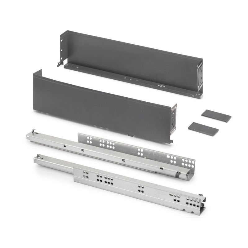 Le kit comprend deux côtés latéraux, un jeu de caches frontaux, un jeu de coulisses et les vis pour fixer la façade. Pour monter le tiroir, il faudra ajouter les panneaux pour le fond et le dos de votre tiroir (à découper selon les dimensions de votre meuble) ainsi que la façade du tiroir. Ce kit tiroir est fabriqué en acier avec une finition peinte gris anthracite ou blanc selon le modèle choisi.