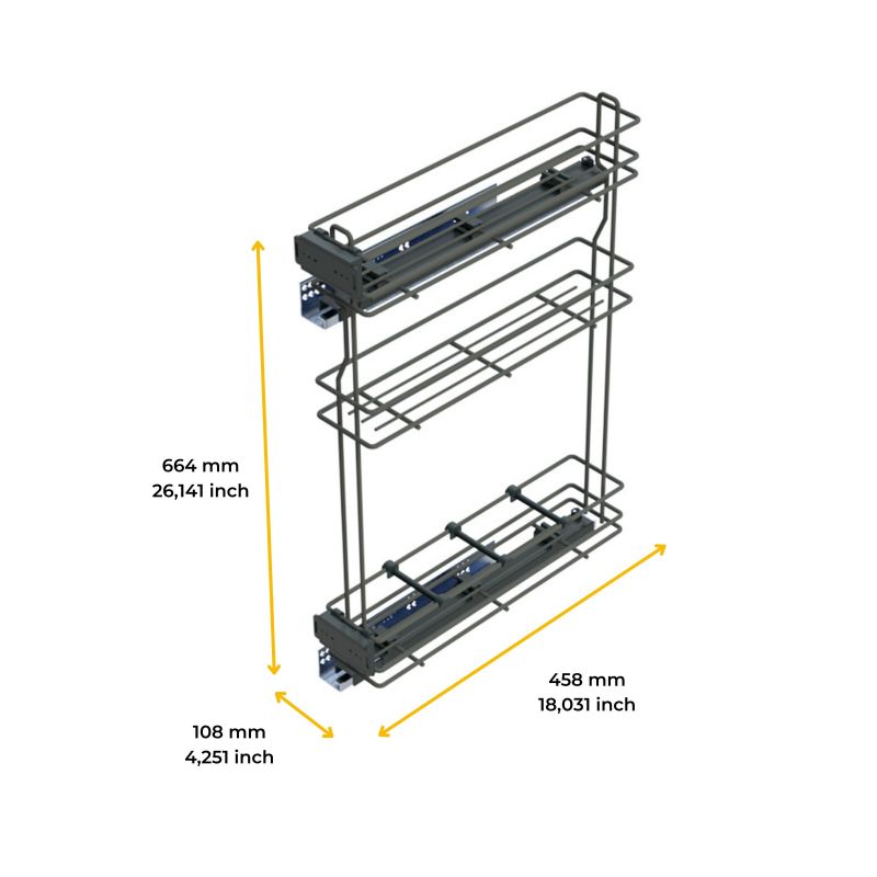 Fabriqué en fil d'acier, le porte-bouteilles TitaneMax possède une structure robuste et durable. Il est installé sur le côté gauche des caissons de cuisine et est compatible avec les meubles d'épaisseur en 16, 18 et 19 mm.. Il dispose de trois niveaux de rangement avec des coulisses invisibles à sortie totale et avec amortisseurs, garantissant un glissement fluide et silencieux. De plus, sa capacité de charge jusqu'à 30 kg assure des performances optimales au quotidien, tandis que ses trois séparateurs pour le panier inférieur permettent une organisation flexible.