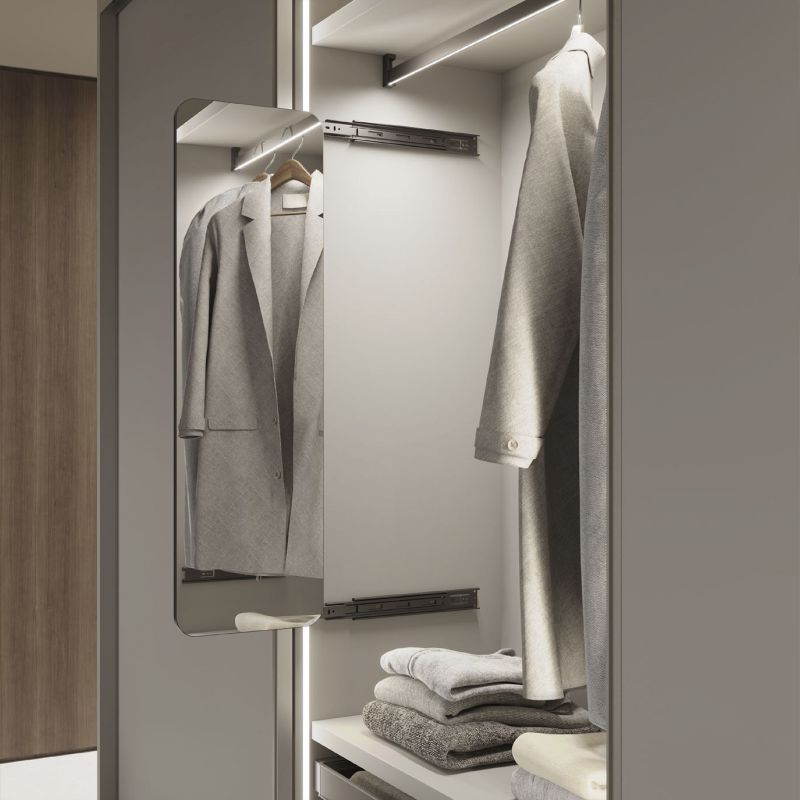 Ce miroir coulisse en douceur et sans bruit grâce à ses glissières à billes de 45 mm avec système de retrait total et un déclencheur qui facilite son démontage. Sa conception polyvalente permet de l'installer aussi bien à droite qu'à gauche, ce qui le rend idéal pour différents types de placards.