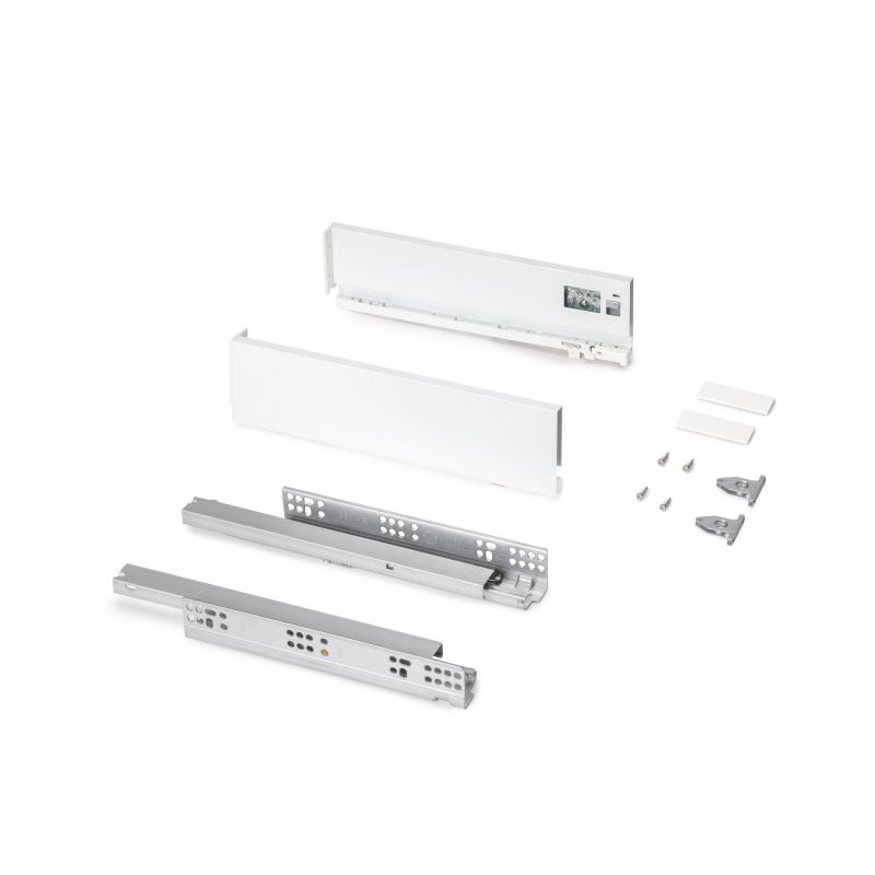 Le tiroir de cuisine et salle de bain Protone est disponible en kit avec toutes les éléments nécessaires pour son montage et offre une grande capacité de charge allant jusqu'à 30 kg par tiroir. Le kit contient les coulisses à sortie totale avec fermeture amortie, les côtés du tiroir et les attaches pour la façade.