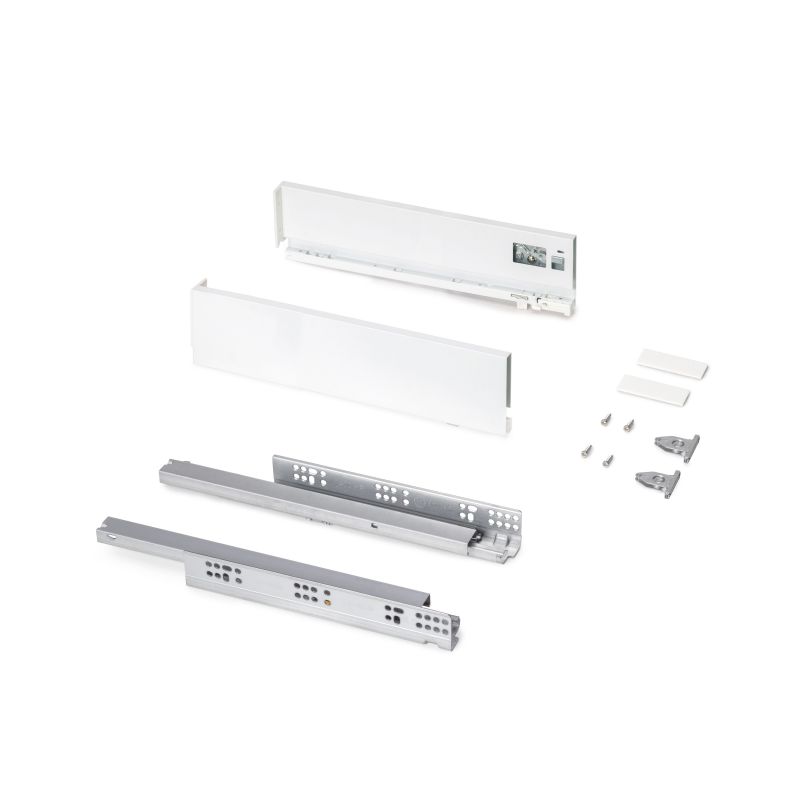 Le tiroir de cuisine et salle de bain Protone est disponible en kit avec toutes les éléments nécessaires pour son montage et offre une grande capacité de charge allant jusqu'à 30 kg par tiroir. Le kit contient les coulisses à sortie totale avec fermeture amortie, les côtés du tiroir et les attaches pour la façade.