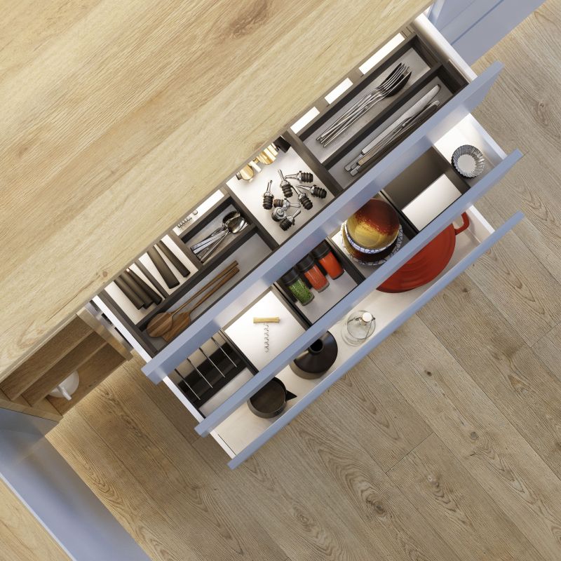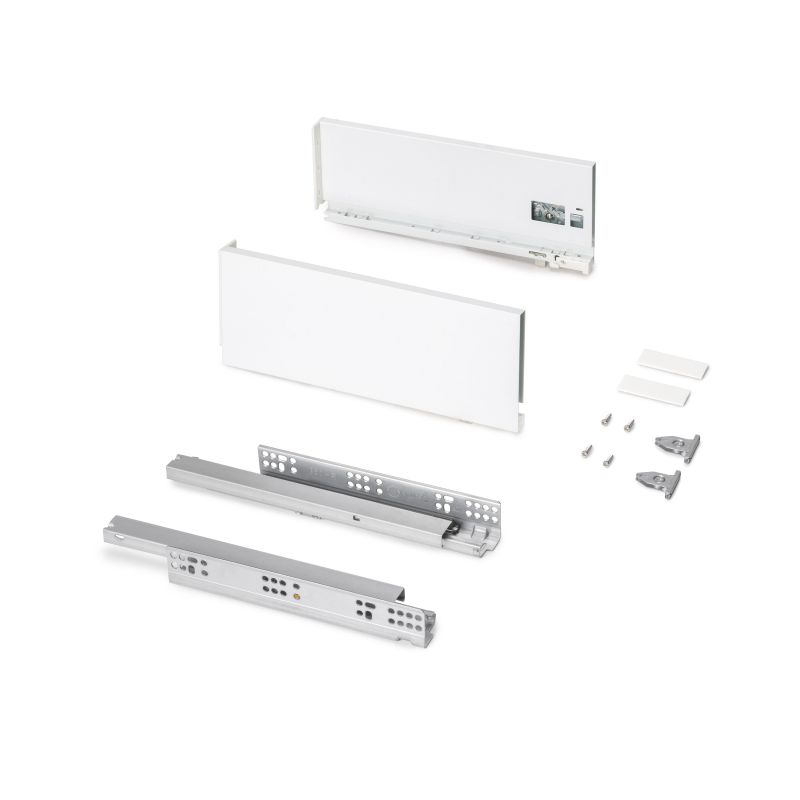 Le tiroir de cuisine et salle de bain Protone est disponible en kit avec toutes les éléments nécessaires pour son montage et offre une grande capacité de charge allant jusqu'à 30 kg par tiroir. Le kit contient les coulisses à sortie totale avec fermeture amortie, les côtés du tiroir et les attaches pour la façade.