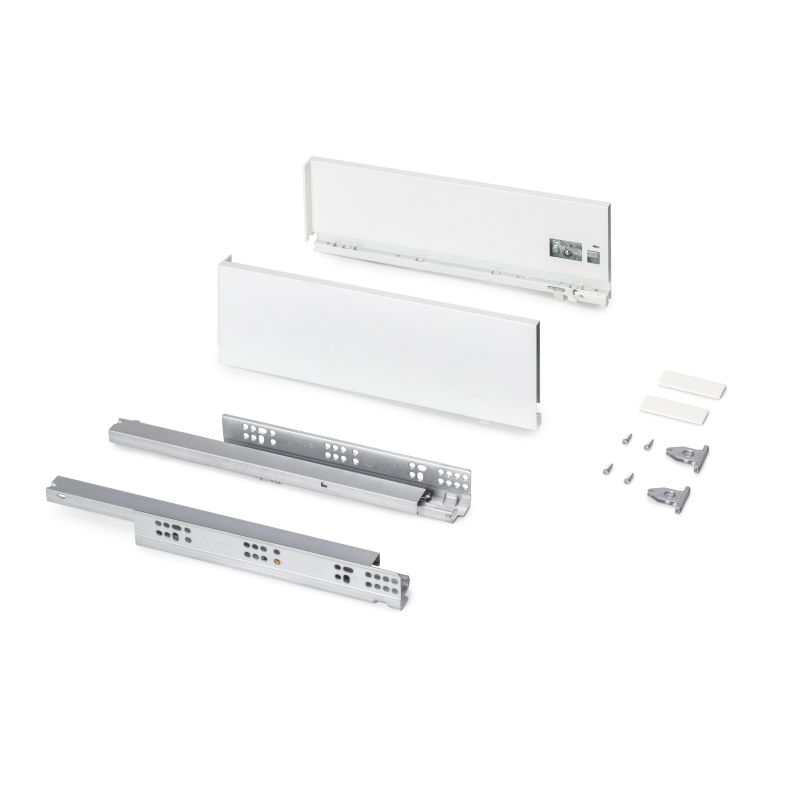 Le tiroir de cuisine et salle de bain Protone est disponible en kit avec toutes les éléments nécessaires pour son montage et offre une grande capacité de charge allant jusqu'à 30 kg par tiroir. Le kit contient les coulisses à sortie totale avec fermeture amortie, les côtés du tiroir et les attaches pour la façade.