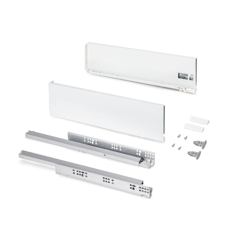 Le tiroir de cuisine et salle de bain Protone est disponible en kit avec toutes les éléments nécessaires pour son montage et offre une grande capacité de charge allant jusqu'à 30 kg par tiroir. Le kit contient les coulisses à sortie totale avec fermeture amortie, les côtés du tiroir et les attaches pour la façade.
