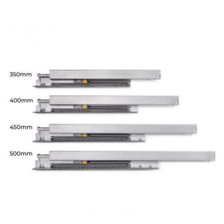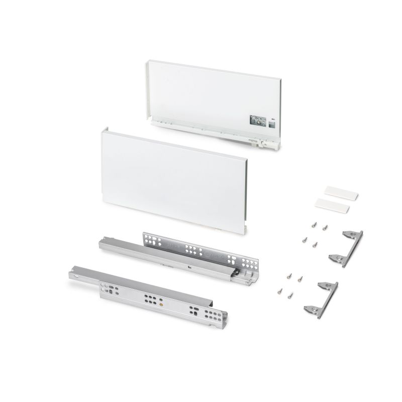 Le tiroir de cuisine et salle de bain Protone est disponible en kit avec toutes les éléments nécessaires pour son montage et offre une grande capacité de charge allant jusqu'à 30 kg par tiroir. Le kit contient les coulisses à sortie totale avec fermeture amortie, les côtés du tiroir et les attaches pour la façade.