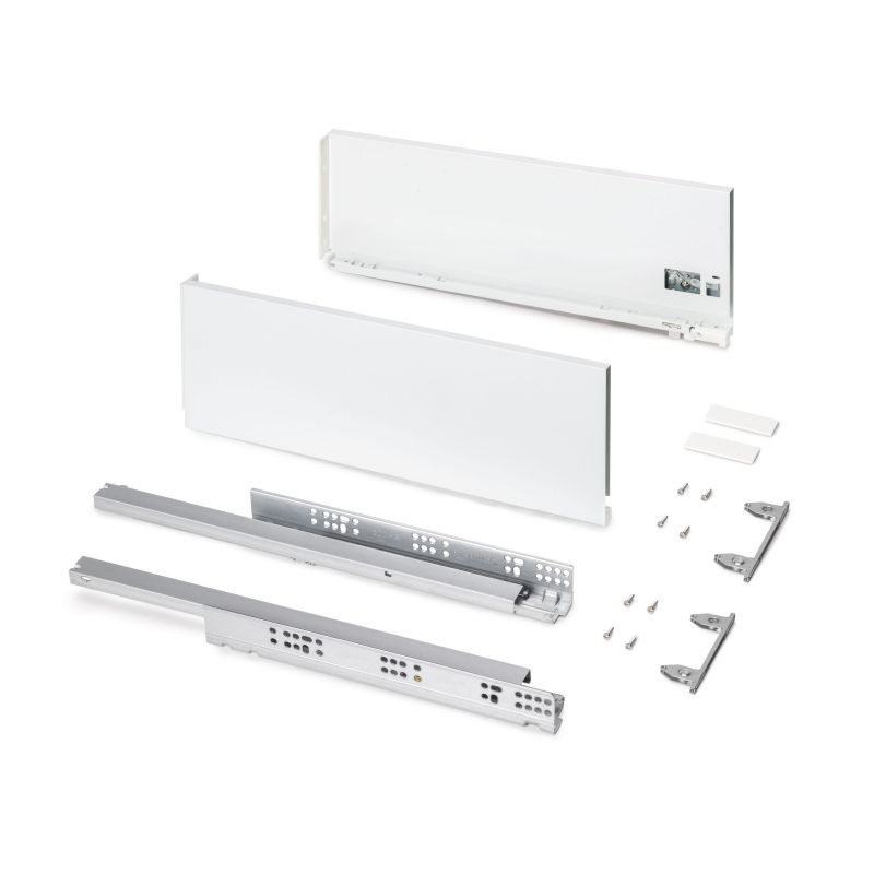 Le tiroir de cuisine et salle de bain Protone est disponible en kit avec toutes les éléments nécessaires pour son montage et offre une grande capacité de charge allant jusqu'à 30 kg par tiroir. Le kit contient les coulisses à sortie totale avec fermeture amortie, les côtés du tiroir et les attaches pour la façade.
