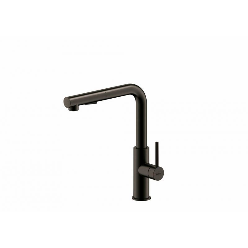 Mitigeur à bec unique. Avec douchette pivotante/extractible (jet/douchette commutable), manette latérale, régulateur de jet laminaire et et cartouche céramique.
