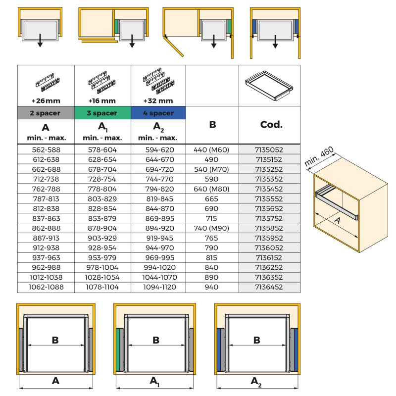 Il est conçu pour s'adapter à différentes largeurs d'armoires, grâce à un ajustement de 13 mm dans chacune de ses glissières et à ses entretoises incluses. Cela permet de s'intégrer dans des largeurs de caissons allant de 562 à 1120 mm et une profondeur maximale de 460 mm, assurant ainsi un réglage précis et polyvalent.