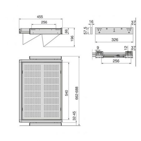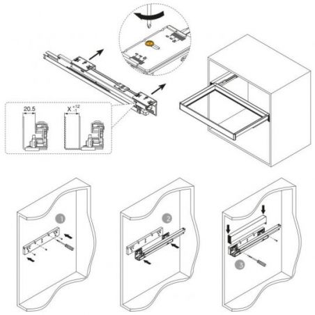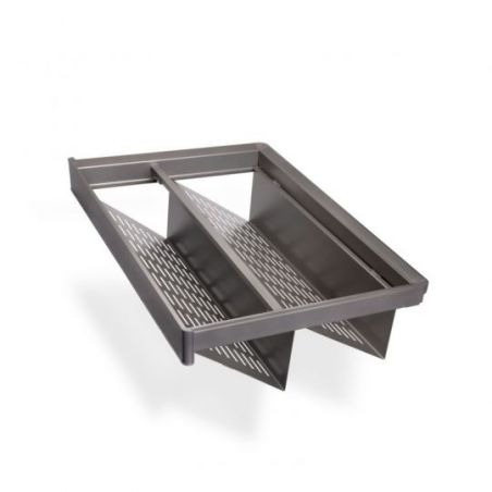 Il est disponible pour des meubles de largeur 600, 700, 800 et 900 mm, avec un réglage jusqu'à 13 mm sur chacune de ses coulisses grâce aux entretoises fournies, ce qui assure un ajustement précis à la largeur intérieure de votre armoire. Son montage est rapide et facile, sans besoin d'outils supplémentaires, il suffit de le visser sur les côtés de l'armoire.