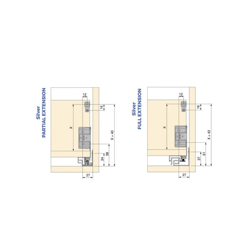 Avec un design élégant et une hauteur de 159 mm, il offre un grand volume intérieur et une finition moderne. Son système permet le réglage de la façade du tiroir de ±2 mm en vertical grâce à une excentrique et de ±1,5 mm en horizontal. Il intègre également la coulisse Silver L à extraction totale avec fermeture amortie et une capacité de charge de 25 kg, garantissant un mouvement fluide et stable.