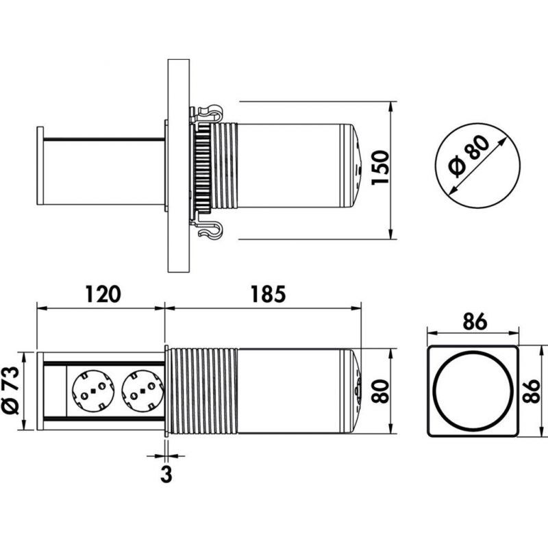 Bloc prises escamotable avec 2 prises et 2 ports USB pour armoires suspendues ou plans de travail.
