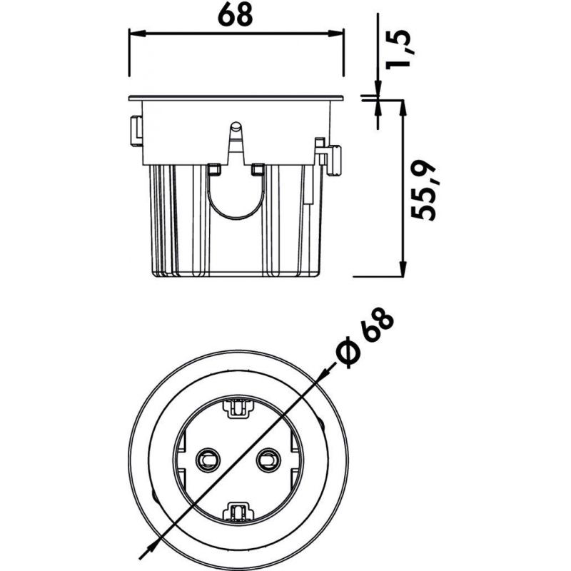 Bloc 1 prise encastrable. À monter dans le plan de travail, le bandeau frontal ou la paroi latérale.