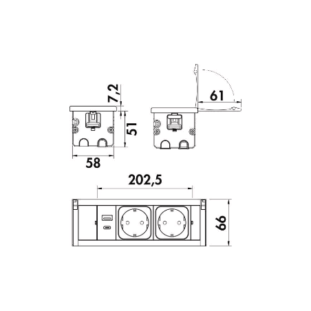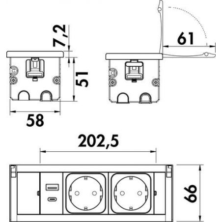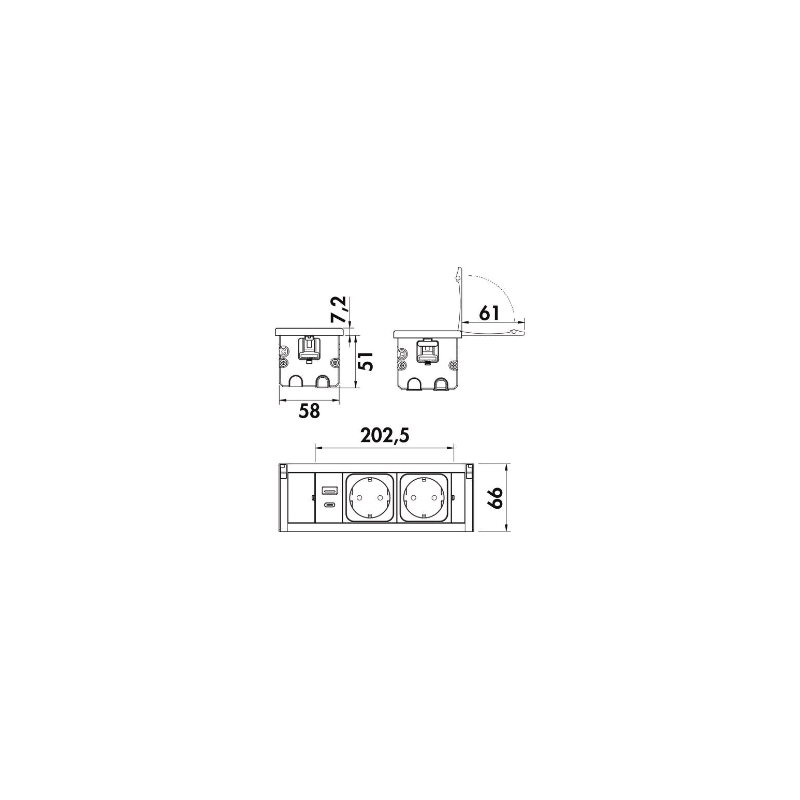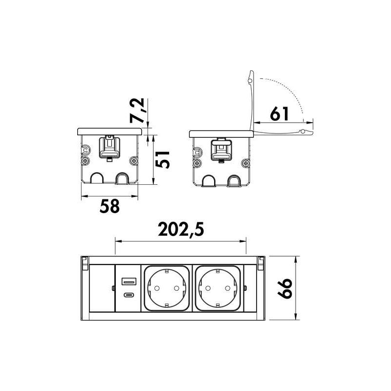 Ce bloc prises encastrable présente des dimensions de découpe d’environ 193 x 59 mm et une profondeur d’encastrement d’environ 51 mm, le rendant compatible avec la plupart des surfaces. Il est équipé de deux prises et de 2 ports USB (A/C), permettant une charge rapide et efficace de vos appareils. Conçu pour une utilisation durable, le VersaLid USB A+C est conforme aux normes de sécurité en vigueur, assurant une utilisation fiable au quotidien.