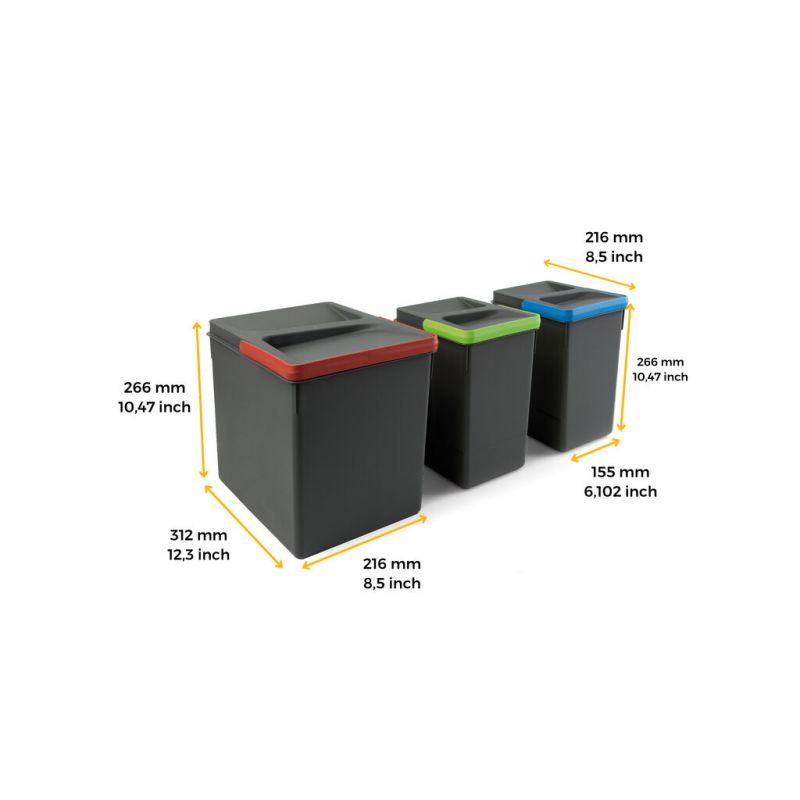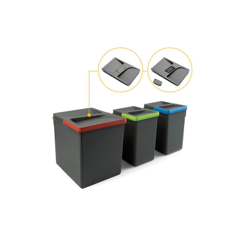 Ce modèle de poubelle pour tiroir est composé d’un bac de 15 litres et de deux bacs de 7 litres. Il offre une solution de tri sélectif complète et parfaitement adaptée aux cuisines modernes. Idéal pour séparer les déchets organiques, recyclables et résiduels, il permet une organisation optimale tout en restant compact. Le couvercle anti-odeurs assure un environnement sain au quotidien, même en cas d’utilisation intensive. Avec sa hauteur de 266 mm et sa finition anthracite élégante, cette poubelle s’intègre discrètement dans les tiroirs de meubles bas tout en facilitant une gestion des déchets propre, efficace et responsable.