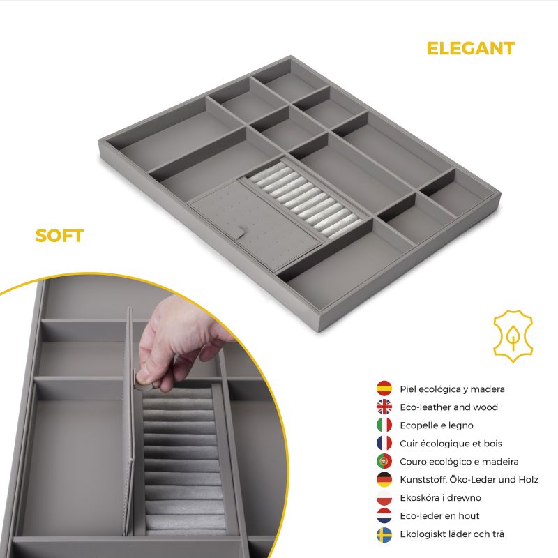 Le tiroir organisateur à compartiments finition titane, est fabriqué avec des matériaux nobles (cuir écologique et bois), et se clipse sans outil sur le châssis. Ses 10 compartiments permettent de classer élégamment vos accessoires, tandis que l’étui avec couvercle protège les objets fragiles de la poussière ou des frottements.