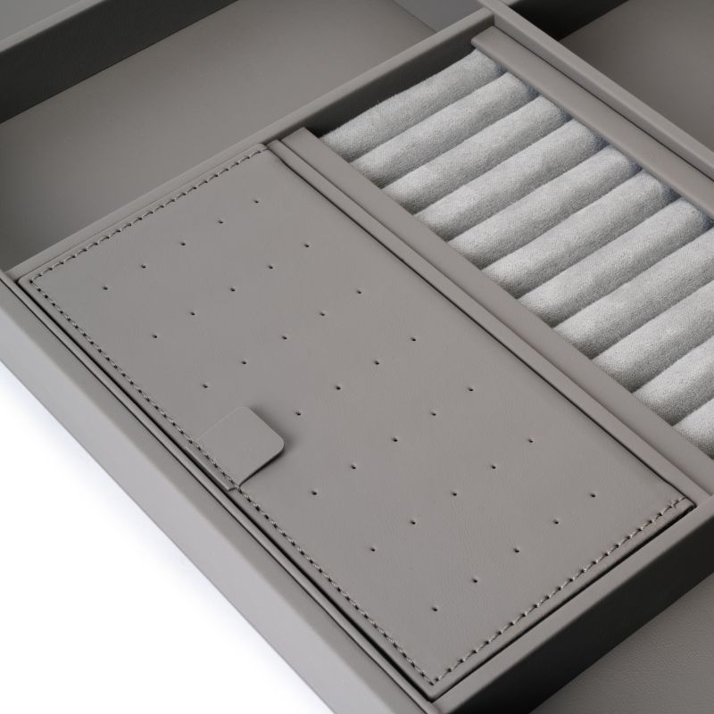 Le tiroir organisateur, en cuir écologique et bois finition titane, est doté de 16 compartiments parfaitement agencés pour accueillir bijoux, lunettes, ceintures ou accessoires textiles. Il se fixe par clips sur le cadre, sans effort. Un étui rigide avec couvercle est également inclus pour protéger les objets sensibles de la poussière.