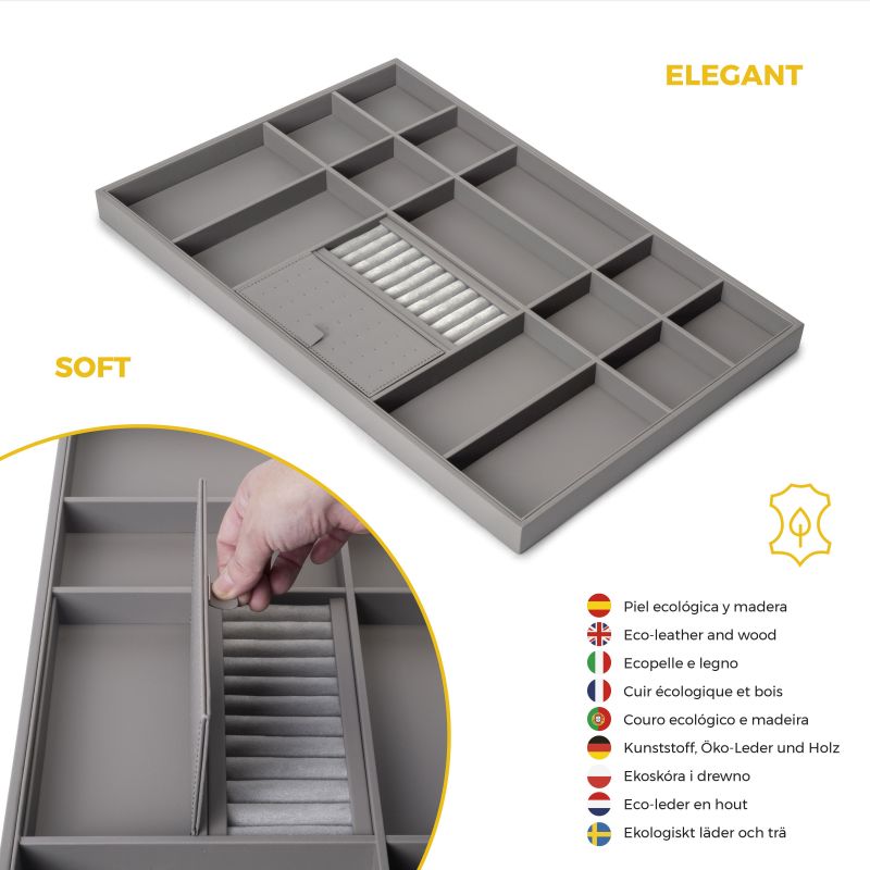 Le tiroir organisateur à compartiments finition titane, est fabriqué avec des matériaux nobles (cuir écologique et bois), et se clipse sans outil sur le châssis. Ses 10 compartiments permettent de classer élégamment vos accessoires, tandis que l’étui avec couvercle protège les objets fragiles de la poussière ou des frottements.