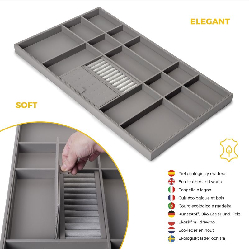 Le tiroir organisateur, en cuir écologique et bois finition titane, est doté de 16 compartiments parfaitement agencés pour accueillir bijoux, lunettes, ceintures ou accessoires textiles. Il se fixe par clips sur le cadre, sans effort. Un étui rigide avec couvercle est également inclus pour protéger les objets sensibles de la poussière.